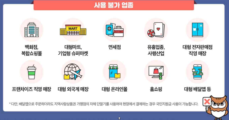 온라인 쇼핑몰, 대기업 계열사 매장, 대형마트, 백화점, 면세점, 유흥업소, 사행성 업소 등에서는 절대 사용이 불가능합니다.