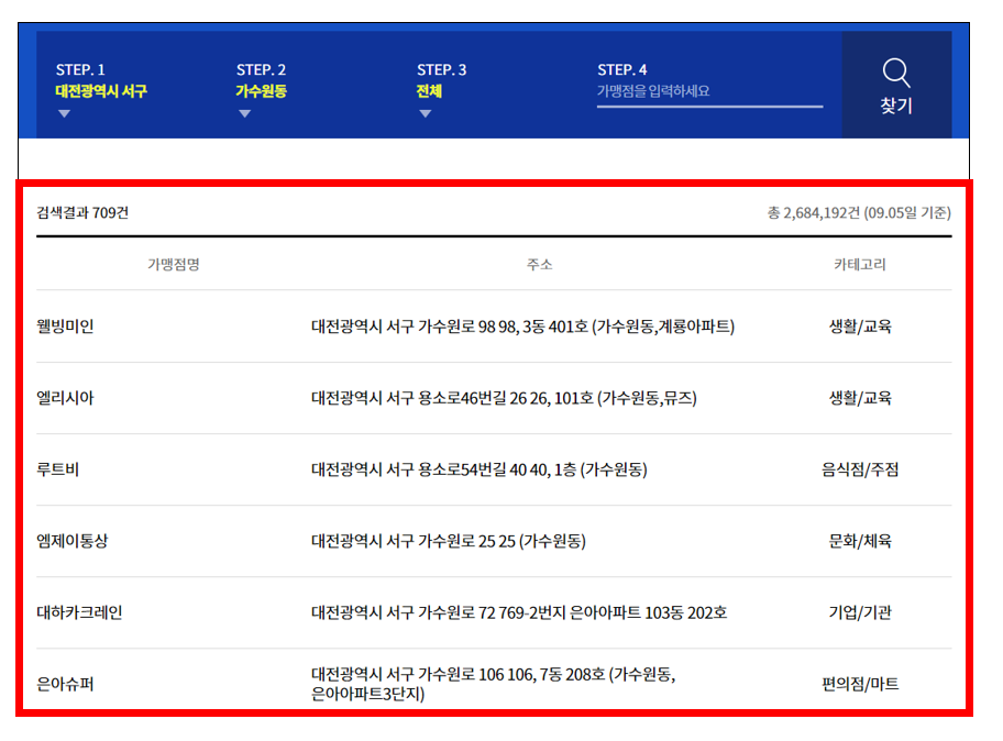 찾기 버튼을 누르시면 아래처럼 우리 동네에서 사용 가능한 가맹점들이 나옵니다.