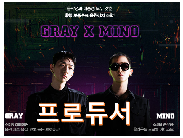 그레이는 AOMG 소속으로 상당히 트렌디한 분 중 한 명입니다. 힙합 음악을 듣다 보면 "그레이"라는 시그니쳐 사운드를 들으신 적 있으시죠? 트렌디하면서도 대중적인 비트도 매우 잘 만드시는 것 같습니다. 쇼미 보시면 가끔 피처링진으로 참여해서 직접 랩도 하는데요. 무대 구성이나 장악력도 좋고, 비트에 어울리는 랩을 굉장히 잘하는 것 같습니다. 수려한 외모가 가장 큰 장점이죠. 다재다능하신 분입니다.